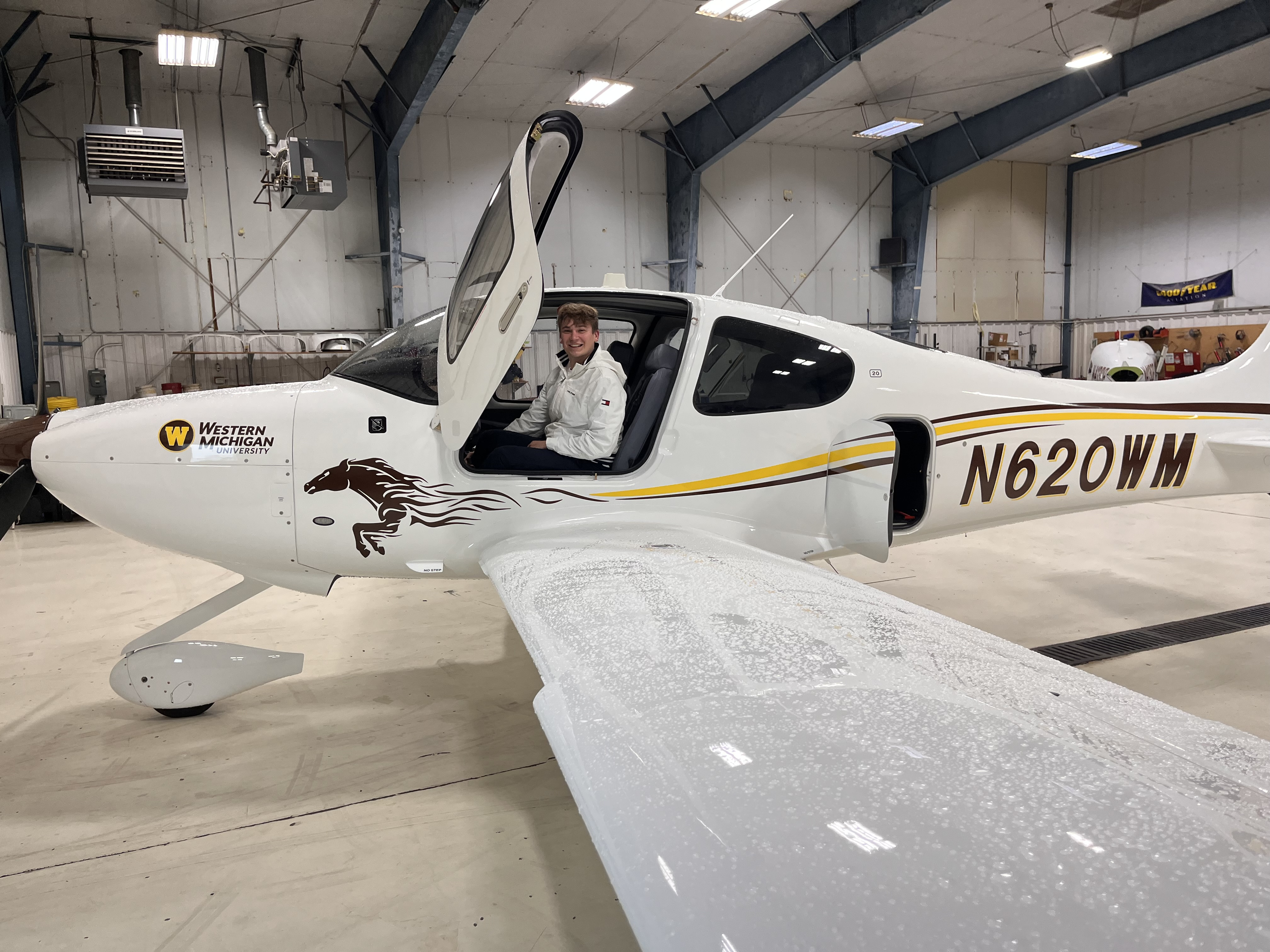 Kevin Grodecki (2023) checks out one of the new Cirrus aircraft at Western Michigan State University, where he is majoring in Aviation Management.