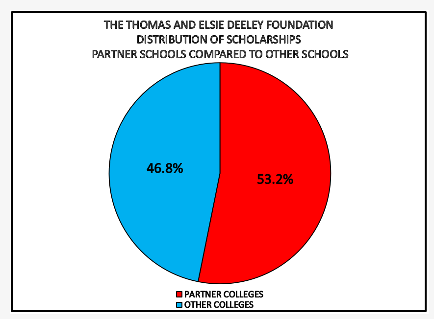 The graph below shows the percentage of the scholarship awards made by The Thomas and Elsie Deeley Foundation and the colleges/universities to which the awards were made.
