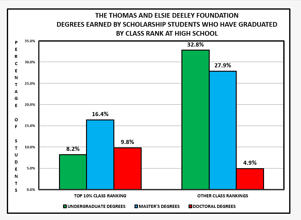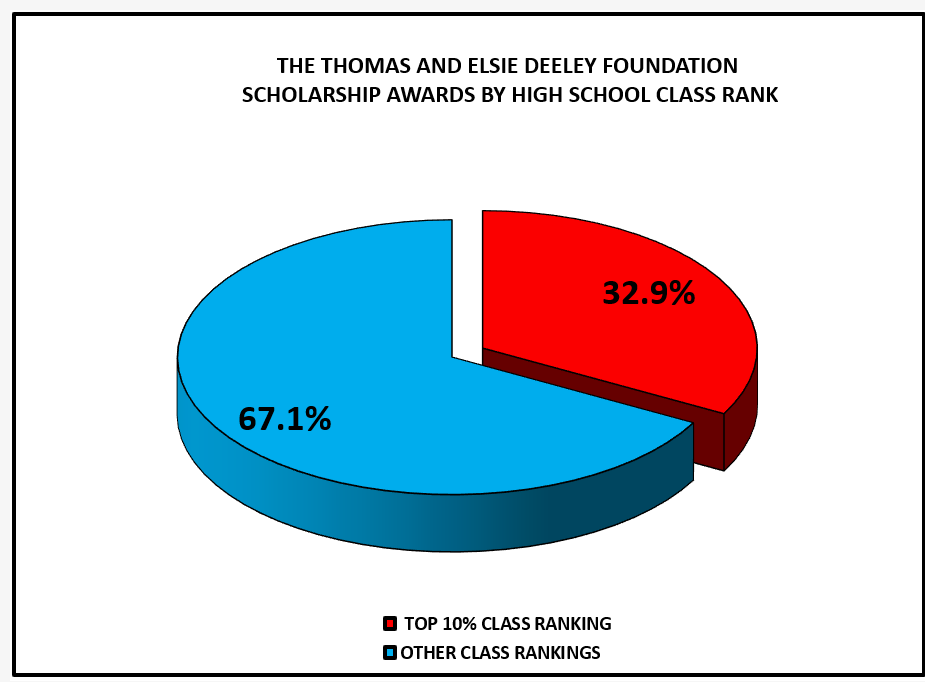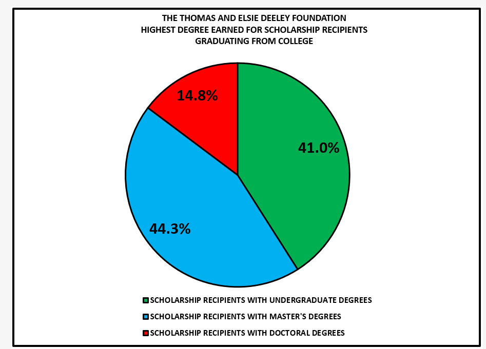 The Thomas and Elsie Deeley Foundation has awarded over $2.7 million in scholarships. Although the amounts of individual scholarships vary, the average value of a four-year scholarship is over $30,000.