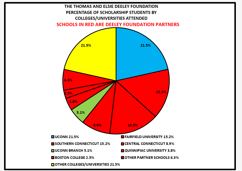 The Deeley Foundation has been successful in creating scholarship partnerships with public universities and private colleges and universities in the Connecticut area. We attempt to form partnerships based on those schools to which our scholarship applicants apply. These partnerships allow the Deeley Foundation to increase our funding dollars and award more money and scholarships to students. Our partnerships continue to evolve.
