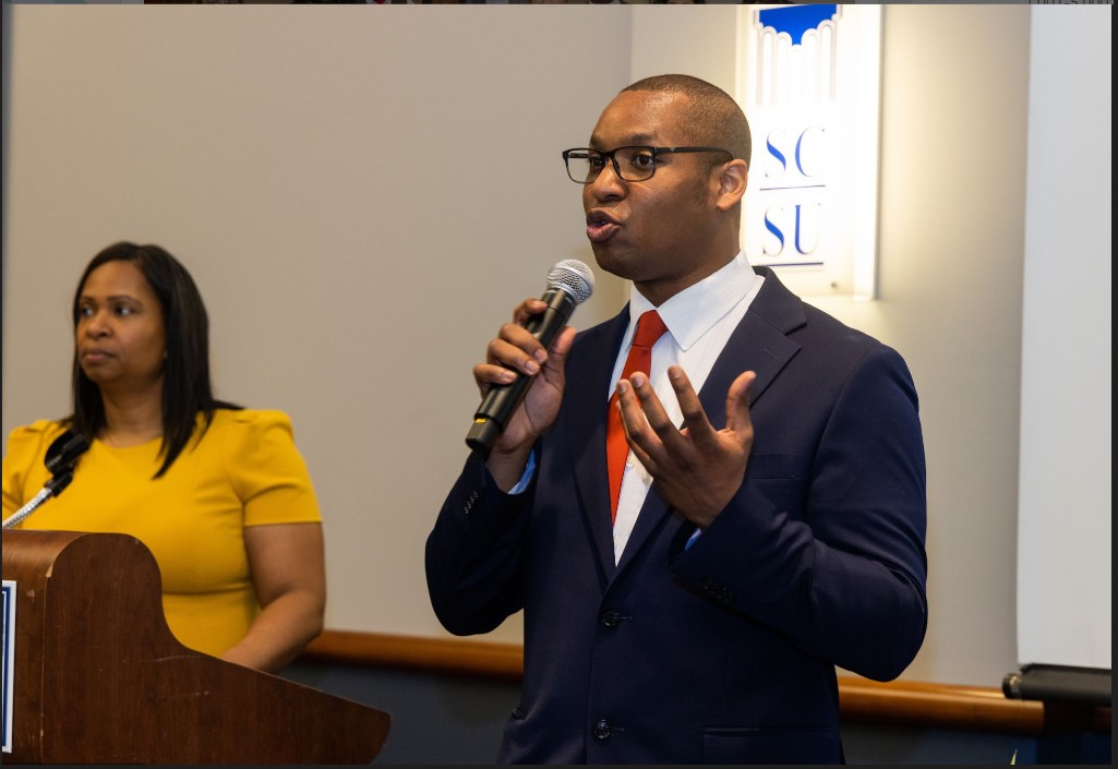 Legairre Radden (2009), a research scientist at Boehringer Ingelheim, speaks at the Biopath Conference sponsored by Southern Connecticut State University. Legairre is a PH.D. candidate at the University of Miami and the CEO of Bridging Pathways, a not-for-profit organization providing opportunities for students.