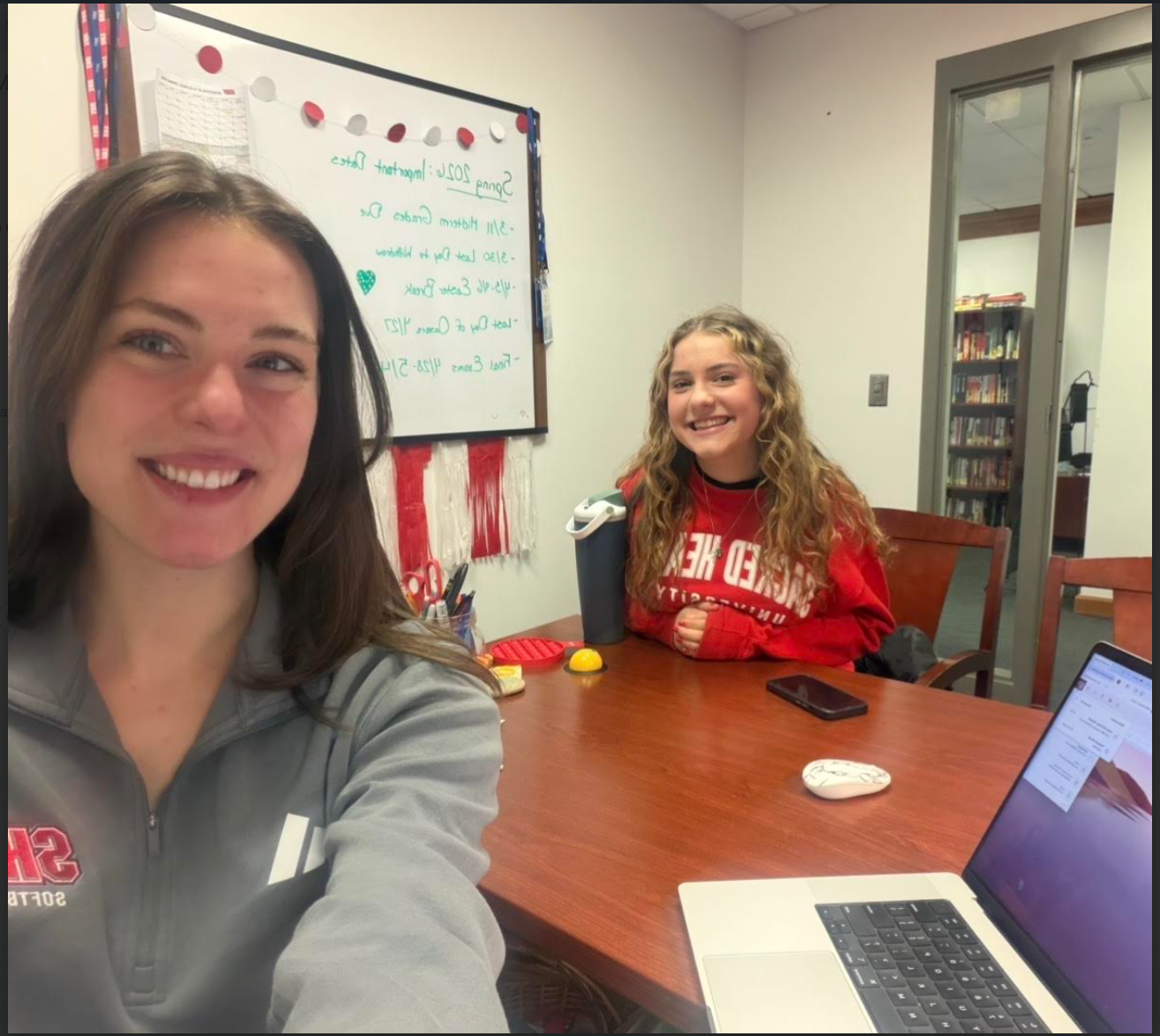 Erin Brown (2017) and Makayla Bloom (2025) chat in Erin’s office at Sacred Heart University, where Erin is the Coordinator of Student Athlete Support Services, and Makayla is a student.