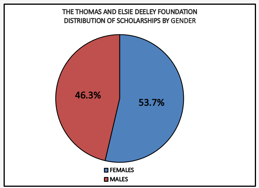 The number of males and females awarded a Deeley Foundation scholarship varies from year to year. However, since our inception, our scholarship awards are about equally distributed between female and male recipients, as can be seen from the chart below: